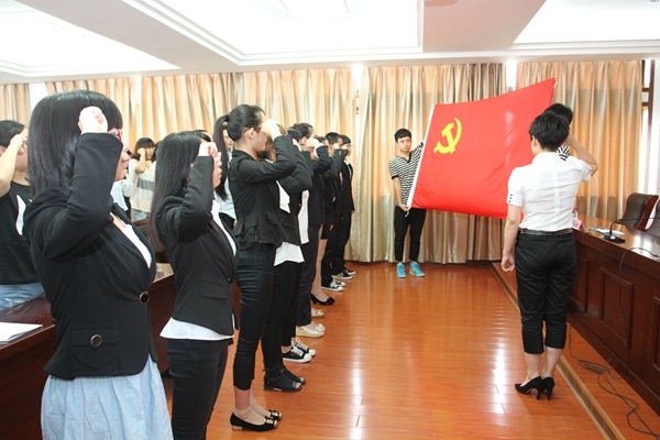 宣誓仪式在慷慨激昂的国际歌声中正式开始。在市优秀党务工作者、政治学院党总支副书记黄薇的领誓下,100名新党员紧握右拳,面对鲜红的党旗庄严宣誓,表达了入党的愿望和遵守入党誓词的决心。