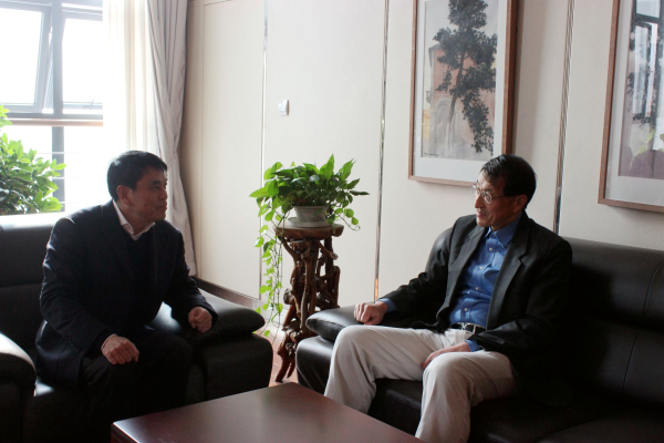 讲座开始前,校长张立钦与朱为模教授座谈交流,就学校在整合专业资源、搭建协同创新平台、扩宽专业合作边界等方面达成共识,并就我校体育学院如何打造专业特色提出建设性意见。