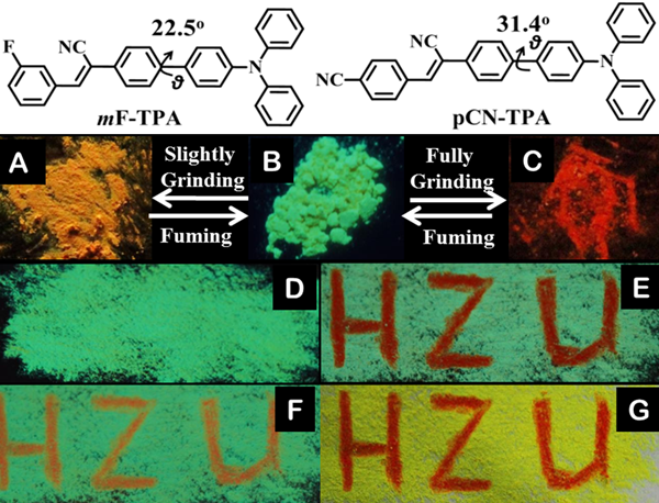 据悉,在此之前,张玉建博士基于HLCT激发态的理念,设计的分子内电荷转移化合物pCN-TPA,在机械力研磨下,绿色粉末逐步变色红色,产生121 nm的红移。在国际上,首次提出在机械力刺激下能进行两种激发态(LE-CT)之间的切换。如图所示,将荧光分子平铺在滤纸上,指甲轻轻滑动,划过的痕迹荧光发生改变,写下字母HZU(湖州大学,Huzhou University, 英文缩写),该成果发表在Chem. Eur. J. 2015, 21, 2474 – 2479。后来,这一成果被香港科技大学唐本忠院士,日本科学家Takashi Kato,北京大学贾欣茹教授,吉林大学张红雨教授,中山大学许家瑞教授在Chem. Rev., Adv. Mater. ChemPhysChem, 和ACS Symposium Series等综述或者专著上对该工作进行详细的报道和评论,引用次数达40次。除此之外,该论文被Web of Science列为2015-2016年度的高被引用论文(ESI),近三年该方向已经有四篇论文入选ESI论文。该项工作得到了国家自然科学基金(51403060, 91227202)和浙江省自然科学基金(LY15E030002,LY16E030011)的支持。