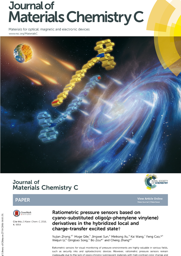 近日,工学院张玉建博士作为第一作者,曹枫教授作为通讯作者的学术论文“Ratiometric pressure sensors based on cyano-substituted oligo(p-phenylenevinylene) derivatives in the hybridized local and charge-transfer excited state”以封面文章(Front Cover) 的形式发表在国际著名材料化学类期刊J. Mater. Chem. C, 2016, 4, 9954--9960上。