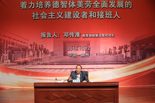 10月12日,教育部政策法规司司长邓传淮来校调研并应邀作报告。报告题目是“深入学习习近平总书记关于教育的重要论述,着力培养德智体美劳全面发展的社会主义建设者和接班人”,校领导、老领导、中层干部及师生党员代表400多人聆听了报告。校党委书记金佩华主持报告。