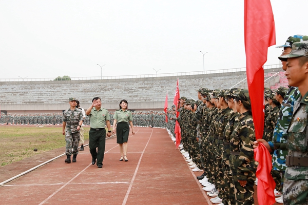 金佩华在军训团相关负责人陪同下检阅各方阵训练成果。同学们眼神坚定,身姿挺拔,以洪亮的口号回应金书记的亲切问候。