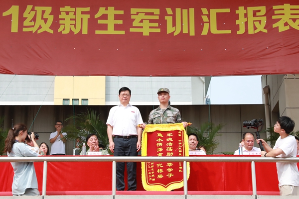 舒志定宣读军训表彰文件,主席台领导为军训先进集体和个人进行颁奖。
