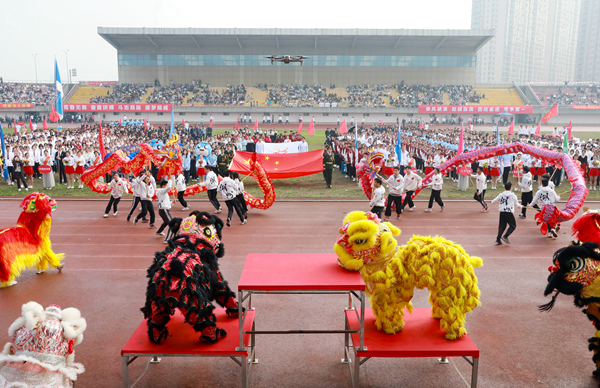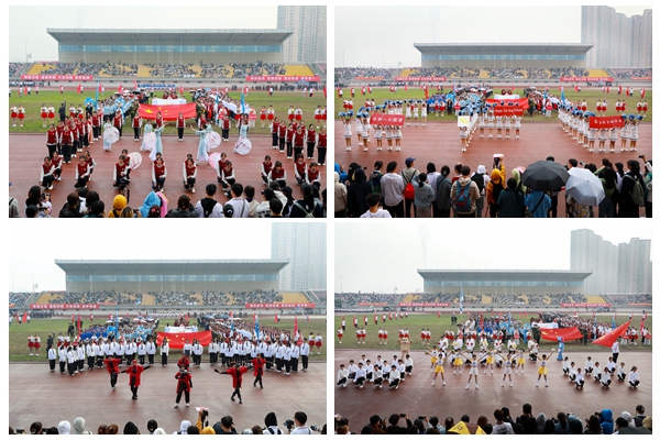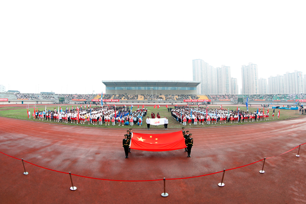 伴随着雄壮的《运动员进行曲》,国旗护卫队、花束队、彩旗队以及全体裁判员、运动员迈着整齐的步伐,精神饱满地步入运动场。