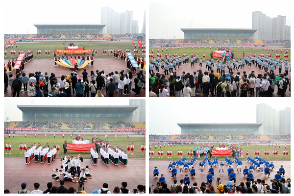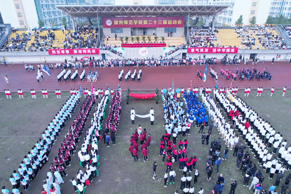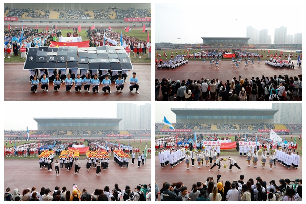 安定书院方阵通过彩带展现了生动活泼的湖师学子模样,以响亮的口号树立了与国无疆的安定青年形象;经济管理学院方阵带着吉祥物商宝一同亮相,通过改编的《经管少年》,展现了敢为人先、勇往直前的经管少年风采;马克思主义学院方阵坚守“明德善政,崇真达治”的院铭,通过音乐与脱贫摘帽相关联,表现了马院学子在思政教育下青春活力、心系祖国的坚定态度;教师教育学院方阵着装鲜艳统一,舞蹈队形变换多样,尽显新时代大学生的青春蓬勃;人文学院方阵身着院服,一曲扇子舞,气度斐然,彰显了人文骄子的非凡风华;外国语学院方阵队伍身姿挺拔,朝气和活力在每一个人身上散发,展现了“语通中外、联达世界”的外院风采;艺术学院方阵以整齐划一的舞步、活力四射的激情瞬间点燃全场,展现了气贯长虹的艺术“蛟龙”气质;理学院方阵激情高昂,口号铿锵,两只玩偶表达着理科生的浪漫;信息工程学院方阵步履坚定,以充满活力的舞姿展现守护祖国未来信息发展的信心;工学院方阵目光坚定,手拿测量尺,展现了工学院一贯的严谨认真的态度;生命科学学院方阵以趣味十足串烧表演、激昂奋进的口号体现了不懈的求知精神;医学院、护理学院方阵身披白色大褂,以“救疾恤患,慎独奉献”为口号,彰显了医学生的责任与担当;继续教育学院方阵,携宇航员玩偶出场,精神饱满,情绪激昂,舞蹈充满青春与活力;国际学院的留学生们身着各国服饰,异域风情给现场带来了别样色彩,齐声呐喊我爱中国,体现了中外友好精神;体育学院舞龙舞狮表演将开幕式推向高潮,热闹的旋律和复杂的动作,体现了体院人的激情与活力。