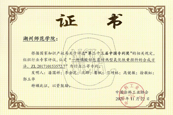 近日,从中国涂料工业协会获悉,我校拥有的“一种磷酸锌包裹耐热型氧化铁黄颜料的合成方法”发明专利荣获 2021年中国涂料行业专利奖二等奖,这是我校发明专利首次获得行业专利奖。据悉,2021年中国涂料行业专利奖一共评选出一等奖3项、二等奖4项、三等奖7项;其中获得一等奖的3项专利获推中国专利奖。