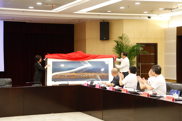 石一婷与陈永华共同为学校向长兴县捐赠的以“晨曦微露的八都岕”为主题的风景油画揭幕,油画作者钟锦芳老师介绍了这幅作品创作思路。