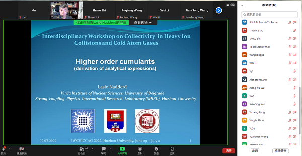 近日,由我校理学院主办的重离子碰撞与冷原子交叉国际研讨会(Interdisciplinary workshop on collectivity in heavy ion collisions and cold atom gases)顺利召开。受疫情影响,会议采用了线上(ZOOM会议)方式进行。美国石溪大学(Stony Brook University)、莱斯大学(Rice University)、东卡罗来纳州立大学(East Carolina University),德国海德堡大学(Heidelberg University),日本筑波大学(University of Tsukuba),丹麦的尼尔斯·波尔研究所(Niels Bohr Institute),塞尔维亚的贝尔格莱德大学 (VINCA, Belgrade),清华大学、北京大学及我校50余位专家学者参加了研讨会。