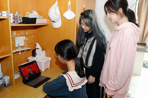 收看结束后,学生们难掩心中的兴奋与喜悦,展开了热烈的讨论。校通讯社社长张逸菲说:“党的十八大以来,我国在各方面都取得了历史性成就,令人鼓舞、令人振奋。中国向上的脚步从未停止,展现了‘经千难而百折不挠,历万险而矢志不渝’的斗争意志,不仅让亿万人民受益,而且时刻激励着我们新时代大学生,一丝一毫不能松懈,应时刻响应国家号召,奋发图强学好本领,用实际行动贡献出青春力量。”