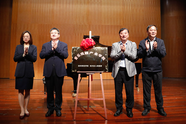 签约仪式后,金佩华、陈永华、潘永锋、朱小芳共同为“优米app怎么下载软件-吴兴区人民政府音乐戏剧产业学院”揭牌。