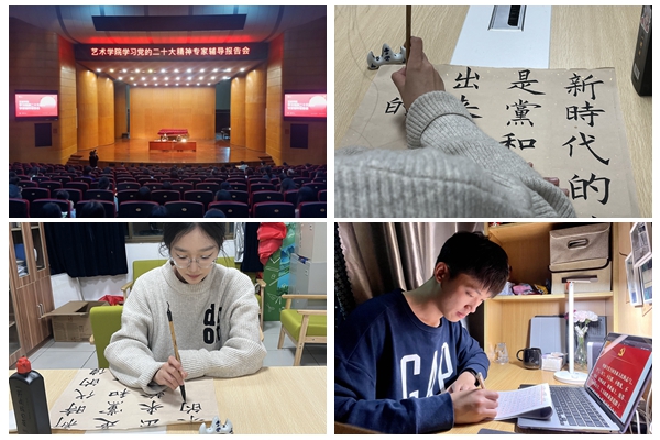 艺术学院举办了党的二十大精神专家辅导报告会,邀请马克思主义学院张建庆教授作题为“路漫漫其修远兮——二十大报告‘中国式现代化道路’解读”的讲座。张教授从“回看”“对比”“远眺”这三个方面展开,通过历史、文化、政治、经济等维度,全面解读了“中国共产党为什么行、中国特色社会主义道路为什么走得通”的原因,阐述了中国共产党作为“问路者、探路者、筑路者”的三重身份。学院还开展了“手抄报告金句,畅谈青春理想”活动,学生党员纷纷手抄党的二十大报告金句。