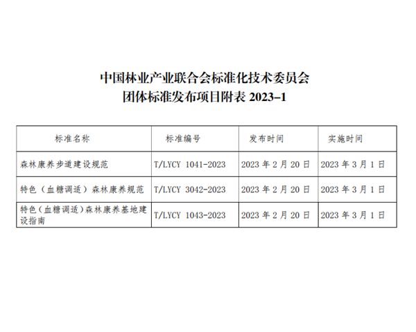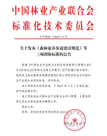 《特色(血糖调适)森林康养基地建设指南》国家级团体标准由中国林业产业联合会森林康养分会提出,由中国林业产业联合会归口管理,由于景宁畲族自治县生态林业发展中心牵头编制并提供经费支持,我校经济管理学院张建国教授牵头组建团队负责具体编制工作。该标准由中国林业产业联合会2021年11月23日正式发文批准立项并正式启动编制工作,编制团队克服新冠疫情影响等困难,多次组织研讨会讨论标准内容,形成征求意见稿后面向全国森林康养基地(企业)征求意见,修改完善后形成评审意见稿。2022年12月26日,由中国林业产业联合会标准化技术委员会、中国林业产业联合会森林康养分会通过线上会议方式组织召开了《特色(血糖调适)森林康养规范》和《特色(血糖调适)森林康养基地建设指南》团体标准专家评审会,顺利通过评审。编制工作团队根据评审专家意见,进行了逐条修改完善形成了报批稿。2023年2月20日,中国林业产业联合会标准化技术委员会以《中产联标[2023]6号》文正式批准发布。