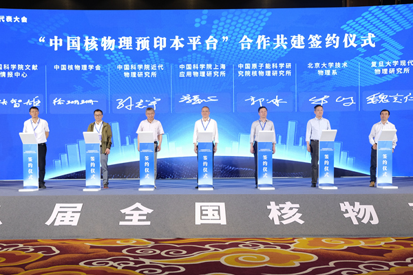 大会的闭幕式上举行了中国核物理预印本平台合作共建签约暨平台启动仪式。仪式上,中国科学院文献情报中心副主任张智雄宣读《中国核物理预印本平台情况简介》,详细介绍了预印本交流及我国建设预印本平台的意义。随后,中国核物理学会理事会秘书长郭冰宣读中国核物理预印本平台管理委员会、科学咨询委员会、首批合作期刊名单。最后,7家合作共建机构代表上台签约,并共同启动中国核物理预印本平台,标志这一平台正式上线发布。期待预印本平台能更更好地服务于科研工作者,服务于国家科技创新事业,提升我国在核物理领域的话语权和影响力。