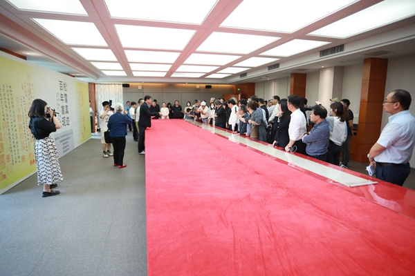 仪式结束后,与会领导、嘉宾和师生们共同欣赏了在湖州巡展的赵孟頫小楷真迹《临黄庭经》。