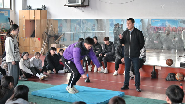 随后,赵老师到武术馆进行实践方面的演练。他请同学做了篮球技能体前变向的教学演示,对学生的讲解进行了点评,并提出了改进方法。赵老师还介绍了体操技能的教学,帮助同学们提高教学能力。