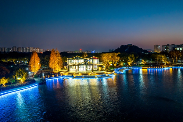 本次亮化工程包括校友中心主体建筑、九曲桥、鹄望亭、德清湖驳岸及植物景观,从而勾勒出校友中心外部轮廓,从整体上提升德清湖夜间景观效果及临湖边界的安全性。项目共安装投光灯269盏,灯带约930米,全部采用LED光源,在保证夜间灯光效果的同时,合理控制亮灯时间,节约运维成本。