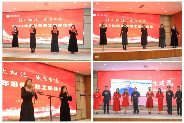 12月27日上午,学校举行“薪火相传 感恩有您”2023年退休教职工荣休仪式。校党委书记金佩华,校长许慧霞,校党委副书记、工会主席陈永华出席,相关职能部门及二级学院负责人、各分工会主席及师生代表70余人共同祝福38位退休教职工。仪式由陈永华主持。