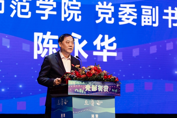 陈永华在致辞中表示,近年来,我校积极融入新时代文化湖州建设,努力助推湖州城市文化内驱力提升,本次活动又是一次繁荣湖州电影文化、助力文化湖州建设的很好机会。电影作为视听融合的综合性艺术,是文化传播的重要载体,也是新时期“以美育人”不可或缺的重要渠道。他希望校地深度合作、持续发力,将湖州大学生电影季办成有一定影响的文化品牌,希望同学们积极参与、勇于尝试,全方位拓展提升自己的艺术人文视野、审美旨趣和综合实践能力,创作自己的微电影,讲好湖师故事、湖州故事、中国故事。