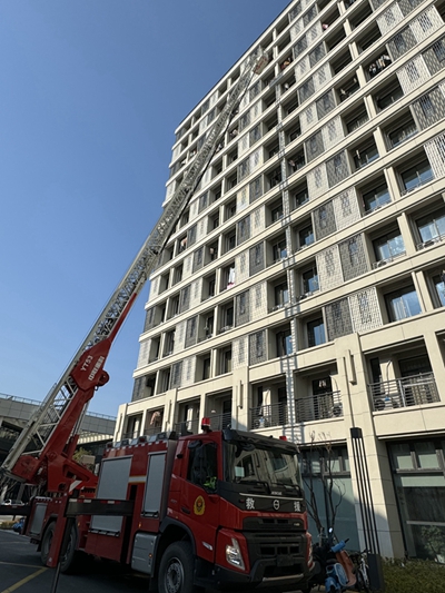 活动中,安保人员在接到火警后第一时间赶赴现场,楼内师生在引导员的组织下沉着应对,迅速、有序地疏散至室外安全区域。校内消防应急救援队人员在1分钟内到达现场用灭火器和室内消火栓进行灭火演练。接到报警的飞英消防救援站人员迅速赶至“事发地点”,在学校安保人员的通力协作下,铺设水带灭火,利用云梯等救出“被困”人员。