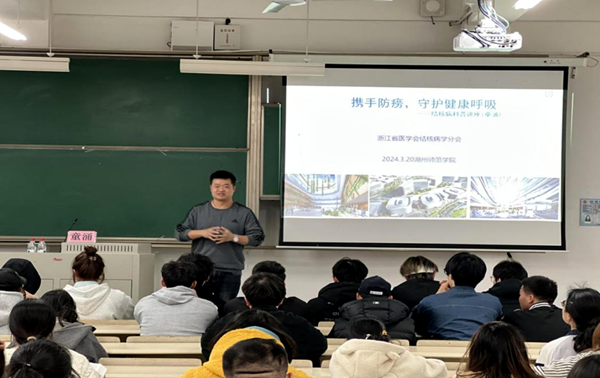 活动现场布置了主题背景墙、宣传横幅、展板等,并设置了结核病防治知识问答抽奖环节,通过现场发放宣传资料,吸引了众多师生踊跃参与。活动特邀了湖州市中心医院童涌医生现场授课,童医生授课图文并茂,深入浅出的讲解了结核病防治知识。
