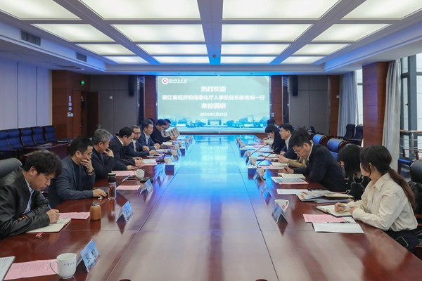 舒志定代表学校对徐吉成一行的来访表示热烈欢迎。教务处负责人就学校发展、办学特色、专业建设和现代产业学院建设等方面介绍了学校基本情况,工学院负责人对我校2021年底获批的浙江省重点支持建设现代产业学院——先进装备智能制造产业学院的基本情况、建设举措、建设成效和工作计划进行了详细汇报。