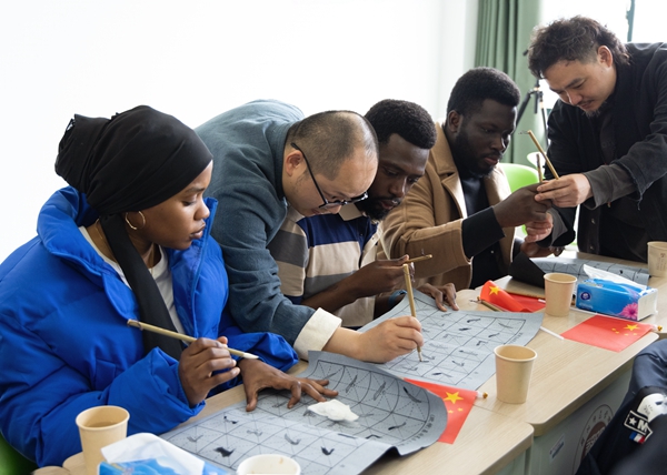 这天,中国毛笔新晋品牌“张小凤”品牌负责人蔡新乔先生将湖笔的制作现场搬到了大学课堂上,让国际学生们亲身体验了如何用菜头和水混合出天然胶水,再给湖笔刷上胶水用以定型的步骤。除了体验湖笔制作的传统手工技艺之外,国际学生们还在蔡先生的指导下学习了如何把胶装好的湖笔进行开笔。之后,国际学生们又拿起了湖笔,进行了书写体验,在横、竖、撇、点间感受着湖笔承载的文化内涵与艺术价值。