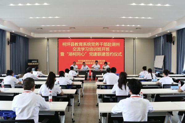 签约仪式后,柯坪县教育系统党务干部赴湖州交流学习培训班开启学习,双方领导及全体党员赴学校党群服务中心参观交流。