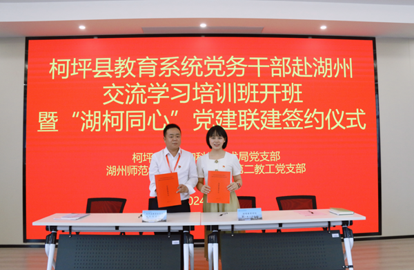 为切实发挥党建引领作用,助力对口支援地区教育高质量发展,7月13日下午,继续教育学院第二教工党支部与柯坪县教育和科学技术局党支部签署“湖柯同心”共进型党建联建协议,并开启柯坪县教育系统党务干部赴湖州交流学习培训班学习。柯坪县教育和科学技术局专职督学韩利峰、继续教育学院党总支书记、院长季志,党总支副书记方君亮,第二教工党支部书记、培训科科长陈琴及双方党员参加本次活动。