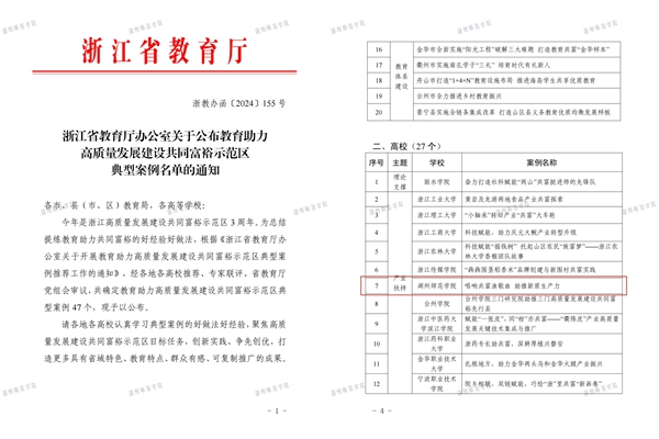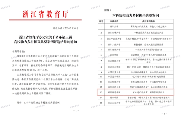 近日,省教育厅办公室先后公布了第三届高校助力乡村振兴典型案例和教育助力高质量发展建设共同富裕示范区典型案例评选结果,我校报送的《农业遗产助共富 湖师智库显担当》入选本科高校案例,《唱响共富渔歌曲 助推新质生产力》入选高校组别案例。