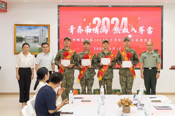 欢送会上,校人武部相关负责人介绍了2024年学校征兵入伍相关情况,宣读秋季应征入伍男兵名单。4名入伍学生依次发言,向老师们致以节日祝福,表达了对军旅生活的无限向往和为国家奉献青春的坚定决心,纷纷表示将以饱满热情和昂扬斗志投入到部队生活中,努力学习军事技能,磨练坚强意志,不负党和人民重托,不负学校和家人培养。学院副书记代表、班主任代表先后发言,深情回顾了与同学们在校期间的相处时光,表达了对大家的期望和祝福,希望他们珍惜军旅时光,不断成长进步,成为有责任感、有担当的新时代军人。