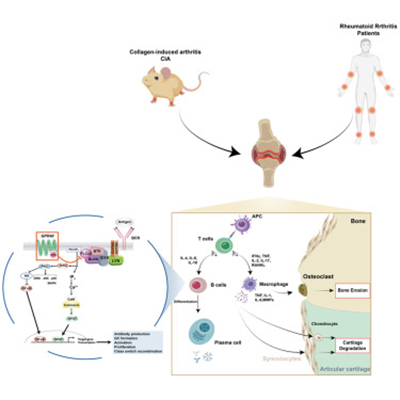 类风湿性关节炎 (RA) 的特征是关节损伤和炎症,B细胞通过产生自身抗体发挥关键作用。在此项研究中,作者团队发现B细胞中的G蛋白偶联受体40(GPR40)缺陷会导致活化、增殖、抗体产生、生发中心形成和类别转换重组增加。GPR40通过与Gαq蛋白结合来调节B细胞受体下游的Plcγ2磷酸化和细胞内钙通量。在GPR40缺陷小鼠中,对胶原诱导性关节炎的易感性更高。GPR40激动剂显示出作为治疗剂的潜力。而临床样本患者样本的调查中,研究发现GPR40在B淋巴细胞中的表达与RA患者中的疾病发作相关。