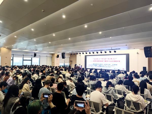 汪建军结合“李约瑟难题”“钱学森之问”,对教育家精神的六个维度进行了阐释,辅以全国优秀教师张桂梅、苏州市教育名家王开东等人的事迹,深入浅出地诠释了教育家精神的时代意蕴。汪建军结合自己特级教师和正高级教师的经历,总结了专业成长六个关键词:激情、坚守、阅读、实践、反思、科研。他认为,教师是一份受人尊重的职业、一份值得自豪的职业、一份完善自我的职业,读书是教师专业成长的重要方式和生命状态,希望学弟学妹们要多读书,读书要善于选择、善于积累、学以致用。教育是做的哲学,需要爱心、责任和智慧,更需要坚守,坚守是职业认同下的自觉。