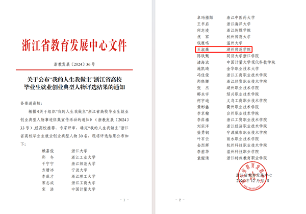 近日,浙江省教育发展中心公布了“我的人生我做主”浙江省高校毕业生就业创业典型人物评选结果,我校2019届本科毕业生王淑薇脱颖而出,荣获浙江省高校毕业生就业创业典型人物。