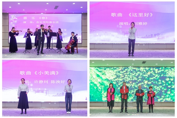 典礼在音乐学院器乐团师生轻快愉悦的节目《春》中拉开序幕。同学们还用《这里好》和《小美满》表达了诚挚而美好的祝福,退休教职工声情并茂的诗朗诵《老有老的骄傲》更是将会场的氛围推到了高潮。