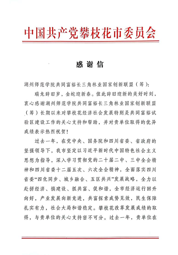 近日,共同富裕长三角林业国家创新联盟(筹)收到来自四川省攀枝花市委市政府的感谢信。信中,攀枝花市委市政府充分肯定了联盟对攀枝花市共同富裕试验区建设给予的大力指导和智力支持,特别是联盟在共同富裕发展研究院建设、林业促进共同富裕理论研究等方面提供的创新方案,为当地高质量发展注入强劲动能。并表达了与联盟开展持续深入合作、实现互利共赢的美好愿景。