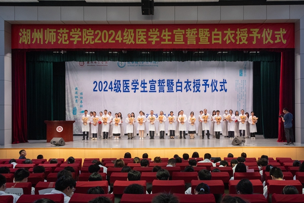 我校2018届临床医学专业校友、浙江大学在读博士杨波作为校友代表发言。他表达了对母校的感激之情,勉励学弟学妹们要潜心学习、专注钻研、勇敢前行、胸怀大志、追求卓越。新生代表、2024级口腔医学专业刘颖同学表示,相聚湖师是一种缘分,来到医学院,就是“医家人”。她号召全体医学生谨记医护工作者的使命和担当,向医学前辈和优秀校友学习,无愧身穿白衣,无愧“医者”之名。