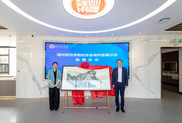 会上,湖州直属分会向母校捐赠了由湖州籍艺术家、我校客座教授张天霖先生创作的《大江行云》画作,许慧霞代表学校接受捐赠并为湖州直属分会颁发捐赠证书。