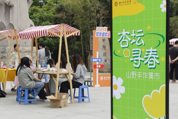 杏坛寻春,脚步丈量母校新颜。在本次校友返校周活动中,教育学院还在胡瑗广场特别设计了“杏坛寻春”山野手作集市活动,邀请校友及其家人参与体验丰富多彩的手工制作活动。艺苑社的“青绿扎染”用棉布方巾承载春色,让校友们在青绿浸染间感受传统工艺的灵动;晨曦儿童文学社的“植物拓染”通过非遗敲拓技艺制作帆布包与书签,定格自然之美;湖学研究会的“花艺帽匠”以鲜花为媒,让校友们亲手设计出专属春日帽饰;陶行知教育研究协会的“手工串珠”、童乡缘梦坊的“粘土塑春”、共鸣社的“艾草锤制作”等摊位人气高涨,校友们以指尖创作记录春韵,以脚步丈量母校新颜,在胡瑗像前共同合影留念,重温缤纷校园时光。