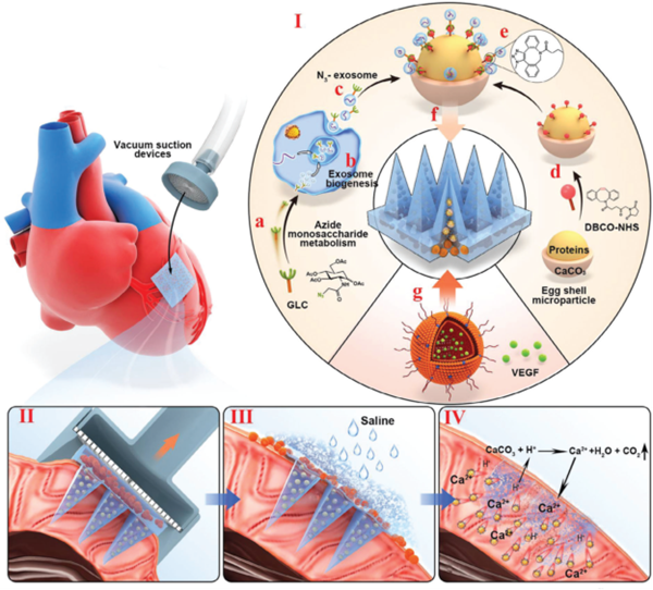 为了解决以上问题,我校和陆军军医大学合作的研究团队开发了一种搭载微型机器人的微针贴片系统,通过靶向心梗 - 酸性微环境实现了外泌体向深部损伤组织的精准递送。实验显示,该智能贴片注射后其基底可释放负载血管内皮生长因子的纳米颗粒,有效附着于梗死心肌组织。研究不仅证实该装置能三维重构心肌梗死区域血管网络,更在大鼠模型中展现出显著的心肌细胞保护效应。此外,还成功通过微创胸腔镜手术在兔和猪心脏中完成了智能贴片精准递送。在利用智能贴片对微环境的精准调控并改善心肌梗死治疗预后方面,这一研究非常具有医用价值。