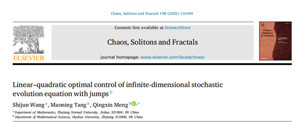近日,我校与浙江师范大学联合培养的数学专业硕士研究生在非线性科学国际著名期刊《Chaos, Solitons and Fractals》(中科院一区TOP,IF:5.3)发表题为“Linear-quadratic optimal control of infinite-dimensional stochastic evolution equation with jumps”的学术论文。该论文第一作者为我校与浙江师范大学联合培养的2021级硕士研究生王仕军,导师孟庆欣教授担任通讯作者,我校为论文的通讯作者单位。