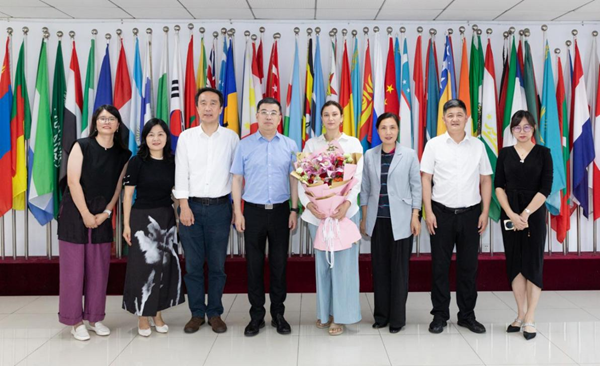 舒培冬、姚楠分别代表省教育厅和省高等教育学会外国留学生教育管理分会向莎何娜斯送上鲜花和祝福。
