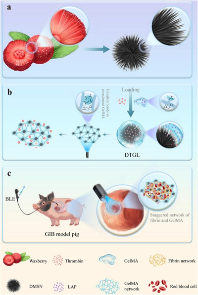为此,我校和陆军军医大学新桥医院合作的研究团队从杨梅果实独特的微纤维结构中获得启发,成功开发了一种具有仿杨梅结构的纳米二氧化硅载体,表面包覆甲基丙烯化明胶,通过蓝光激光在内窥镜下实现快速激活,形成稳定的智能纳米凝胶网络。这种新型纳米凝胶仅需5秒即可在出血部位快速启动凝血过程,即便对于凝血功能障碍患者也具有显著疗效。研究进一步证实,该纳米凝胶所形成的血凝块稳定性强,能够有效抵御消化道内的严酷环境,防止继发性出血。此外,注射后的凝血酶快速将纤维蛋白原转化为纤维蛋白,构建了增强凝块稳定性的双网络结构。实验显示,这一双网络系统在肝硬化患者的血液中表现出优异的粘附性能和止血效果,同时在小型猪食管、胃及十二指肠出血模型中也获得显著疗效,具有广泛的临床应用前景。