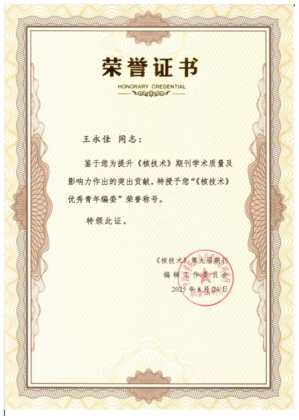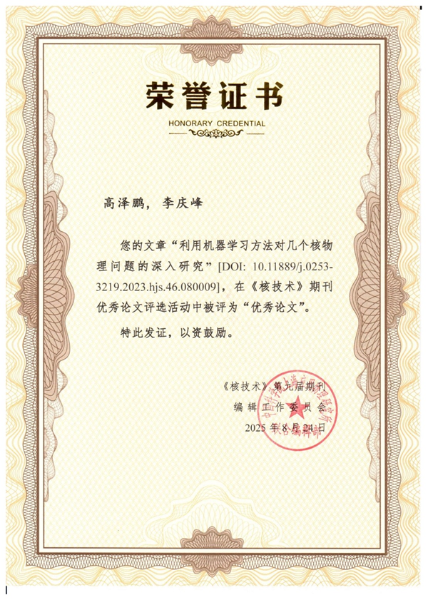 近日,《核技术》和《Nuclear Science and Techniques》期刊组织的“核科技前沿创新发展研讨会暨两刊编委会第三次全体编委大会”在上海复旦大学(江湾校区)召开。由我校李庆峰教授担任通讯作者、我校联合培养的硕士生高泽鹏(现为中山大学在读博士生)为第一作者的论文《利用机器学习方法对几个核物理问题的深入研究》,荣获2024年度《核技术》“优秀论文”称号。我校王永佳教授因在提升《核技术》期刊学术质量与国际影响力方面作出的突出贡献,被授予“《核技术》优秀青年编委”荣誉称号。