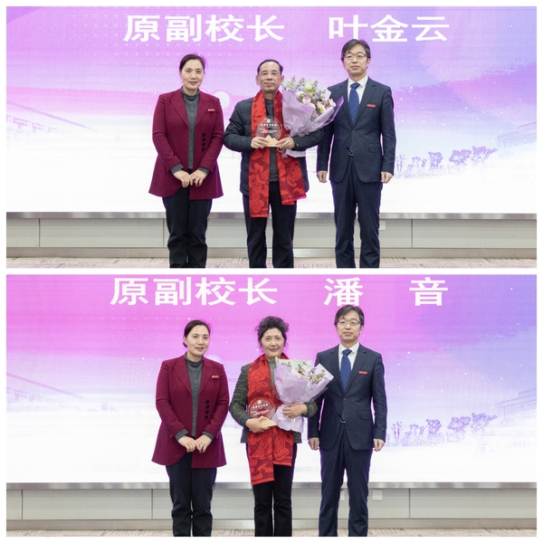 许慧霞、盛况为荣休教职工一一送上定制的荣休纪念杯和鲜花,一句“感谢您为学校发展做出贡献,祝您身体健康,阖家幸福”,朴实真挚的话语,表达了学校对每一位退休教职工的感恩之心和祝福之意。