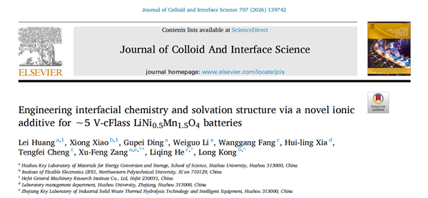 近日,我校理学院臧旭峰副教授以我校为第一单位在化学领域知名期刊《Journal of Colloid and Interface Science》(中科院一区TOP,IF:9.4)上,发表题为 “Engineering interfacial chemistry and solvation structure via a novel ionic additive for 5 V-cFlass LiNi0.5Mn1.5O4 batteries”的研究文章。