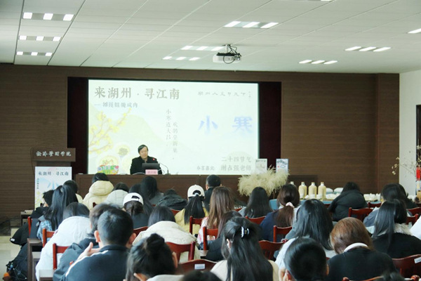 谢占强老师以“小寒节气感受江南风物”为核心,展开了生动细致分享。作为土生土长的湖州人,谢老师结合自身多年的研究成果与生活阅历,详细介绍了湖州传统的小寒习俗,阐释了这些民俗背后蕴含的对未来的美好愿景,更串联起江南百姓敬畏自然、勤俭持家、珍视亲情的传统美德,让在场师生在了解民俗文化的同时,潜移默化地接受品德熏陶,深刻体会到江南民俗中“食”与“时”、“技”与“德”的紧密关联。