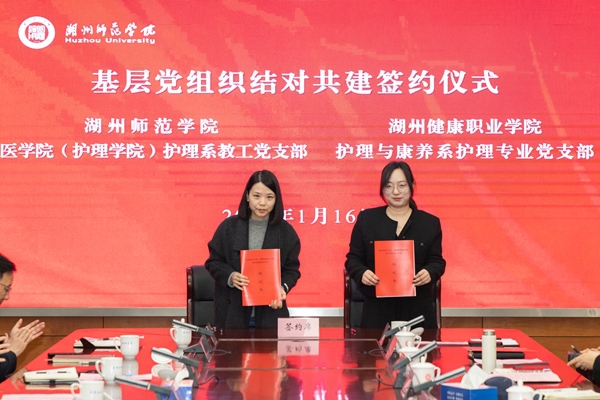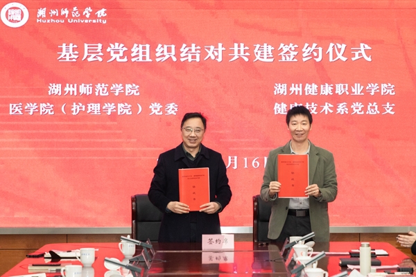 会议进一步让两校深化了认识、凝聚了共识,明确了后续合作共建的重点目标和任务,为推动双方党建与事业发展深度融合打下了坚实的基础。会上,双方还举行了基层党组织结对共建签约仪式。我校医学院(护理学院)党委与湖州健康职业学院健康技术系党总支负责人,我校医学院(护理学院)护理系教工党支部与湖州健康职业学院护理与康养系护理专业党支部负责人分别签署了结对共建协议。