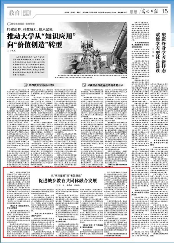 2026年1月20日,《光明日报》15版发表我校浙江省乡村教育研究中心研究员刘佳、李茂森、刘剑虹的署名文章《促进城乡教育共同体融合发展》。全文如下: