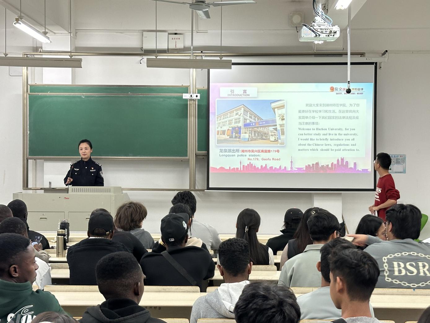 11月5日,湖州市龙泉派出所杨美怡警官为全体国际新生带来了一场实用的普法宣传讲座。